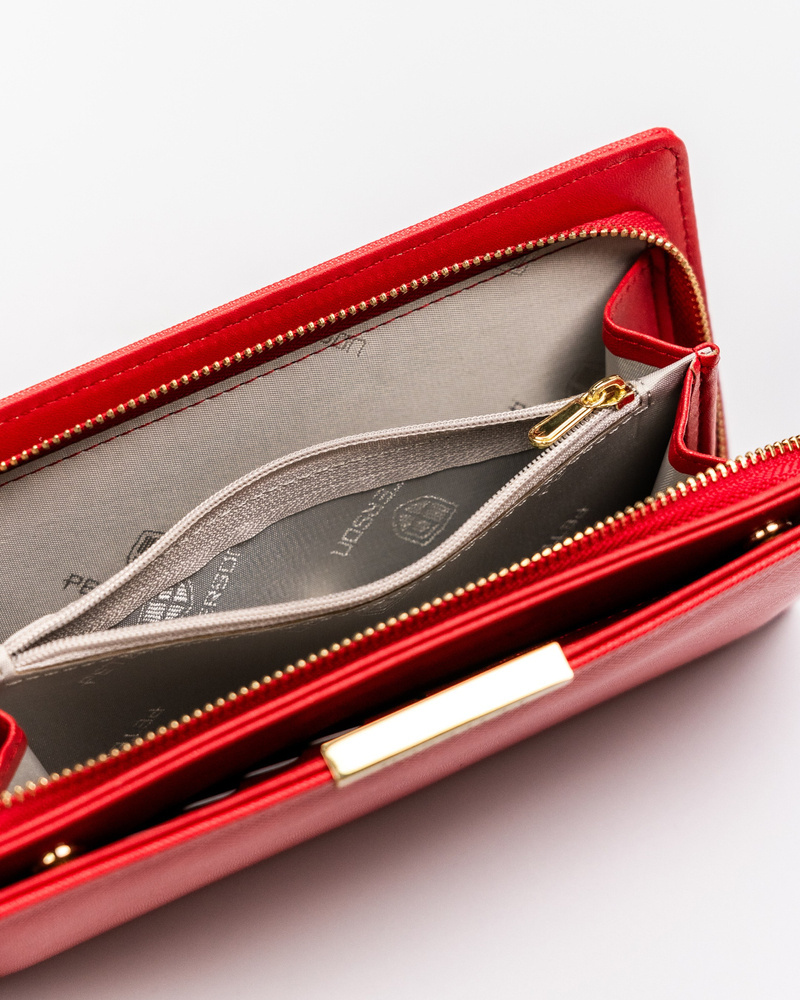Uszyty ze skóry ekologicznej saffiano, bardzo trwałej i przyjemnej w dotyku. Model w orientacji poziomej zapinany na zatrzask i suwak. Pomieści duże ilości kart, pieniędzy i dokumentów. Wyposażony w technologię RFID.