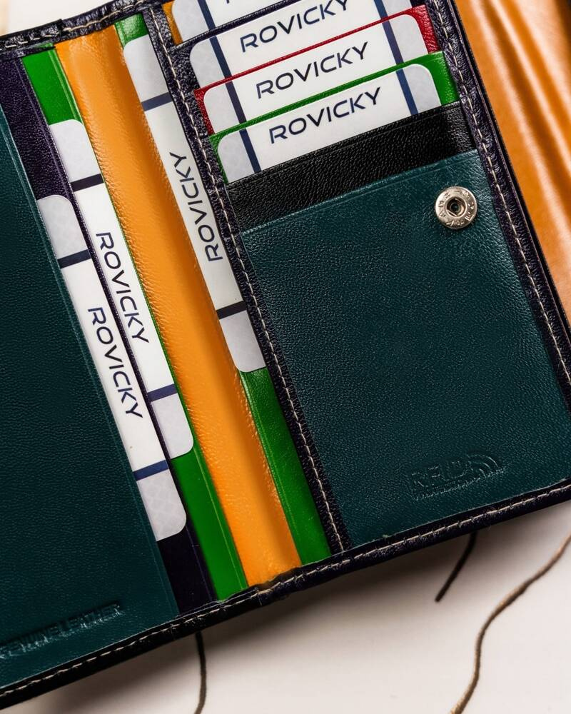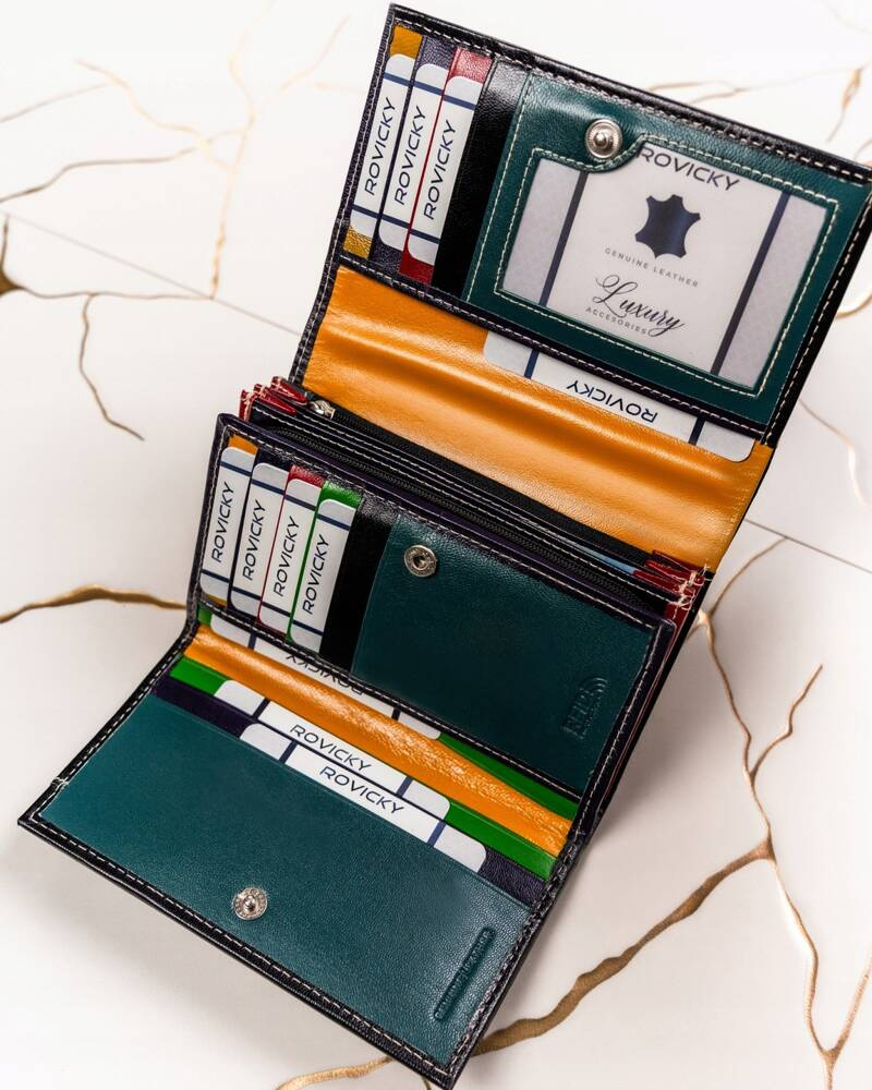 Portfel uszyty z mocnej i trwałej skóry naturalnej bydlęcej, lekko połyskującej, lecz nie lakierowanej. Stylowy portfel o ponadczasowym fasonie z pięknym kolorowym środkiem. Wyposażony w technologię RFID i 9 przegródek na karty.