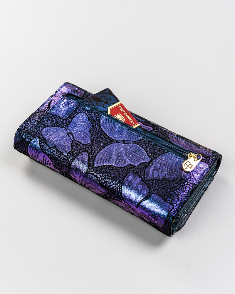 Odszyty ze skóry naturalnej, którego faktura zdobiona jest holograficznymi motylkami. Środek jest dobrze zorganizowany i posiada dużo miejsc na karty i dokumenty. Wyposażony w system RFID.
