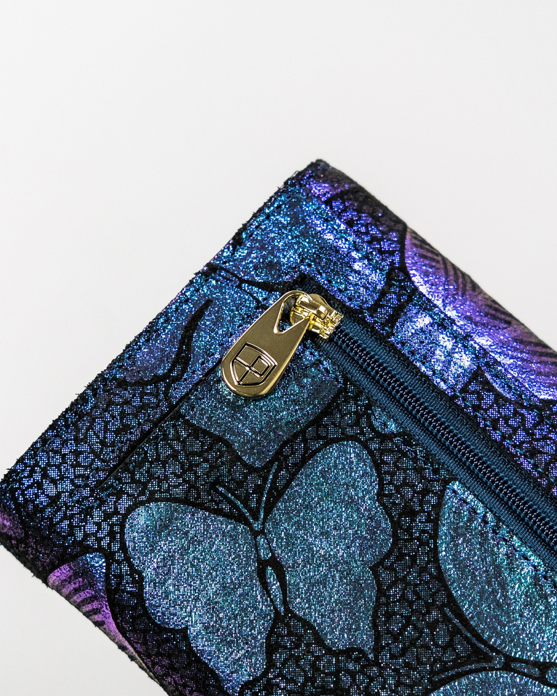 • Ciekawy wzór | Odszyty ze skóry naturalnej, którego faktura zdobiona jest holograficznymi motylkami;