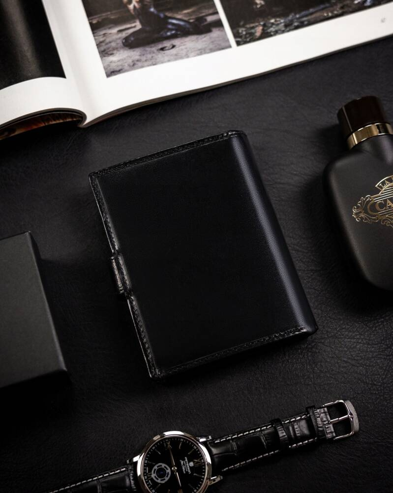 - Klasyczny, ponadczasowy design | Portfel w orientacji pionowej zapinany na zatrzask. Czarny kolor oraz prosty fason bez przesadnych zdobień;