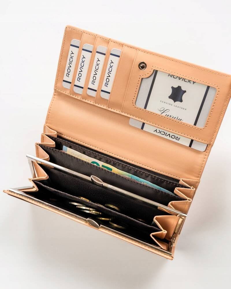 Do portfela bez trudu zmieścisz dowód rejestracyjny. Przegródki na karty i dokumenty zabezpieczono podszewką. Pozwala to uniknąć otarć na skórze, podczas wkładania i wyjmowania kart.