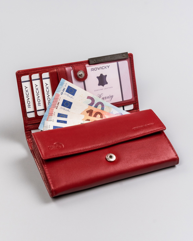 • 4 kieszonki na dokumenty w większym formacie, jak dowód rejestracyjny w okładce. Jedna z tych kieszonek mieści się po zewnętrznej części, z tyłu portfela i jest otwarta. Zalecamy jednak, by ważne dokumenty przechowywać  wewnątrz, zamykanego napą portfela;