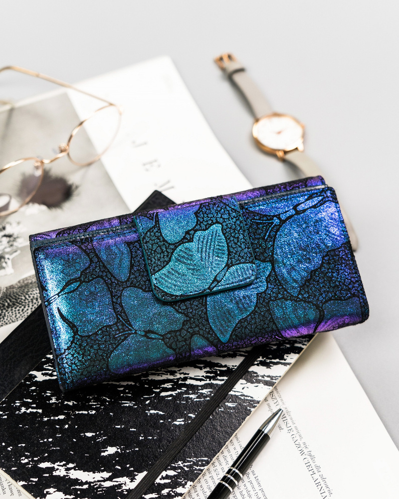 - Klasyczny fason z oryginalnymi detalami | Portfel o klasycznej stylistyce i nietypowym holograficznym wzorze w motylki. Model w orientacji poziomej, zapinany bezpiecznym i trwałym zatrzaskiem, dodatkowo na froncie portfela widnieje złote logo marki;