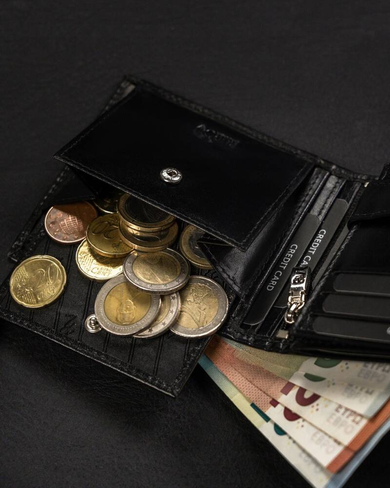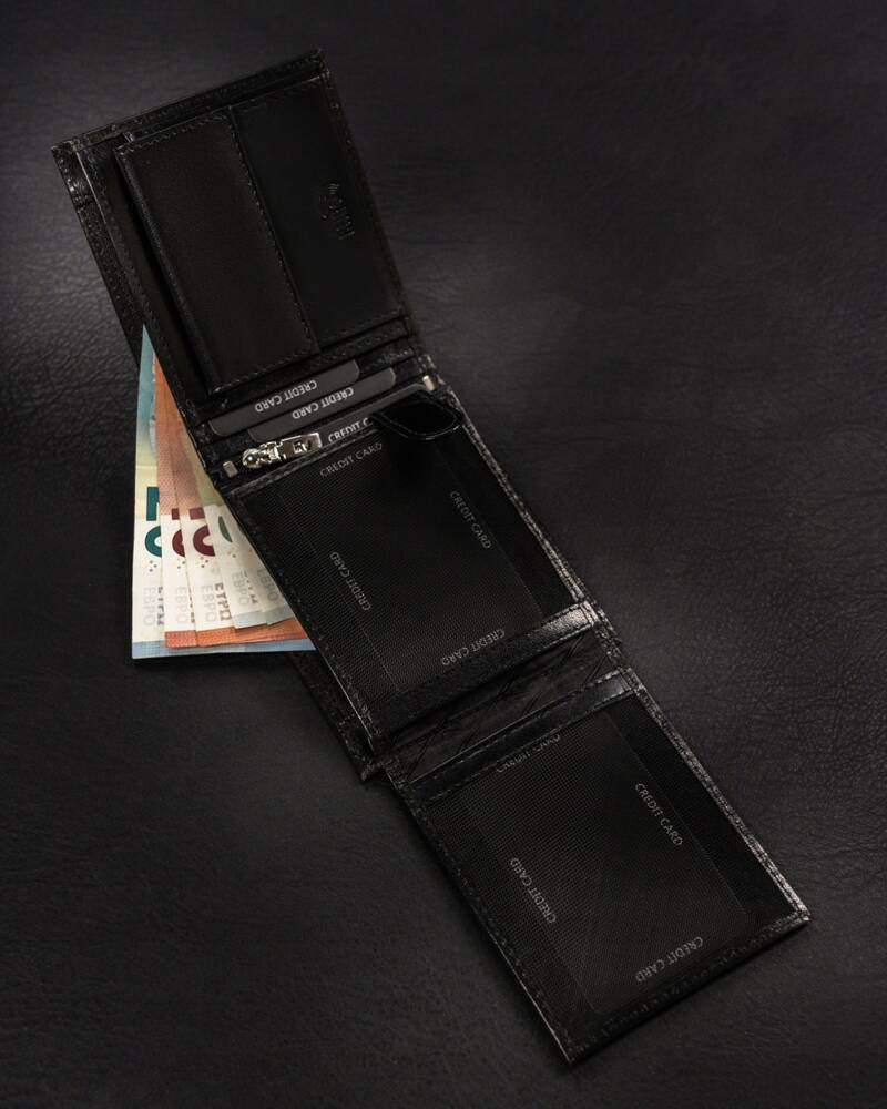 - 2 schowki na suwak, pierwszy w centralnej części portfela, drugi za sekcją na banknoty.