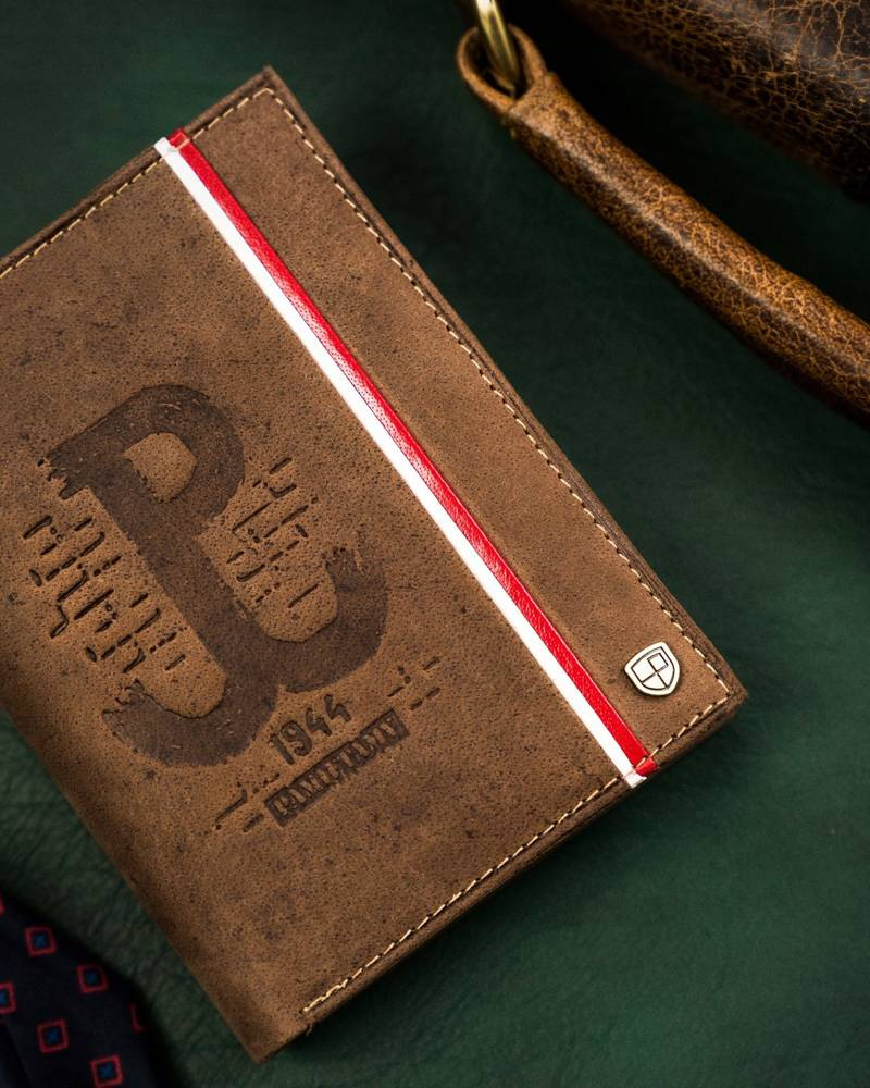 Odszyty bardzo trwale z doskonałej jakości skóry naturalnej nubukowej. Portfel o klasycznej stylistyce. Model w orientacji pionowej bez zapięcia zewnętrznego. Na froncie tłoczony motyw przedstawiający znak Polski Walczącej.