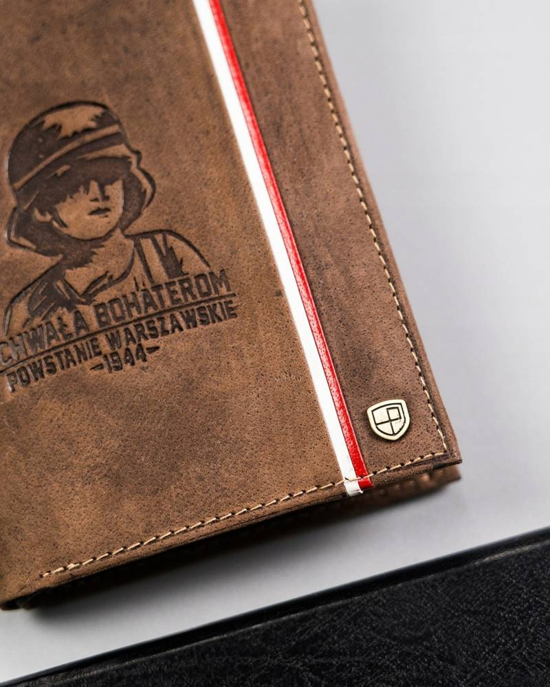 Odszyty bardzo trwale z doskonałej jakości skóry naturalnej nubukowej. Portfel o klasycznej stylistyce. Model w orientacji pionowej bez zapięcia zewnętrznego. Na froncie tłoczony motyw przedstawiający Małego Powstańca.