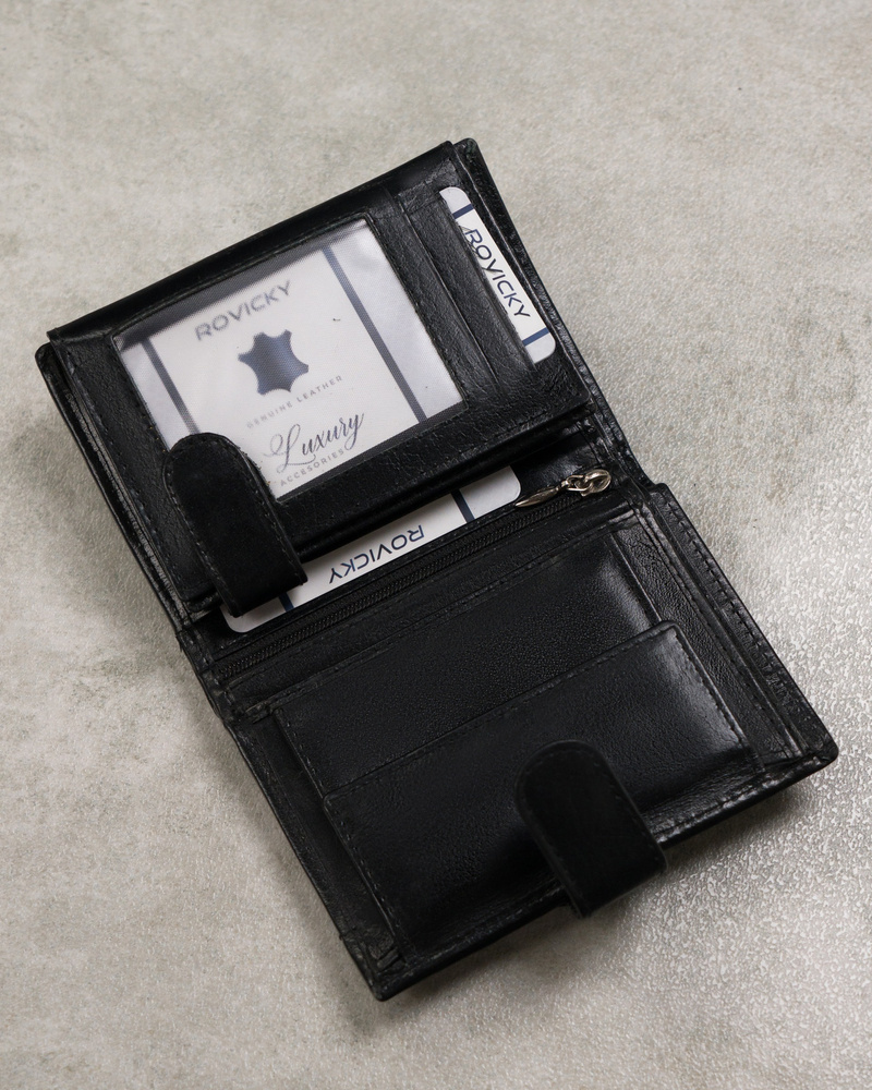 Duży portfel z zapinką na zatrzask. Wykonany ze skóry naturalnej dobrej jakości. Wewnątrz liczne zakładki na karty oraz duże kieszenie na dokumenty mieszczące dowód rejestracyjny. Na rewersie praktyczna kieszonka na kartę. Akcesorium z RFID Protect.