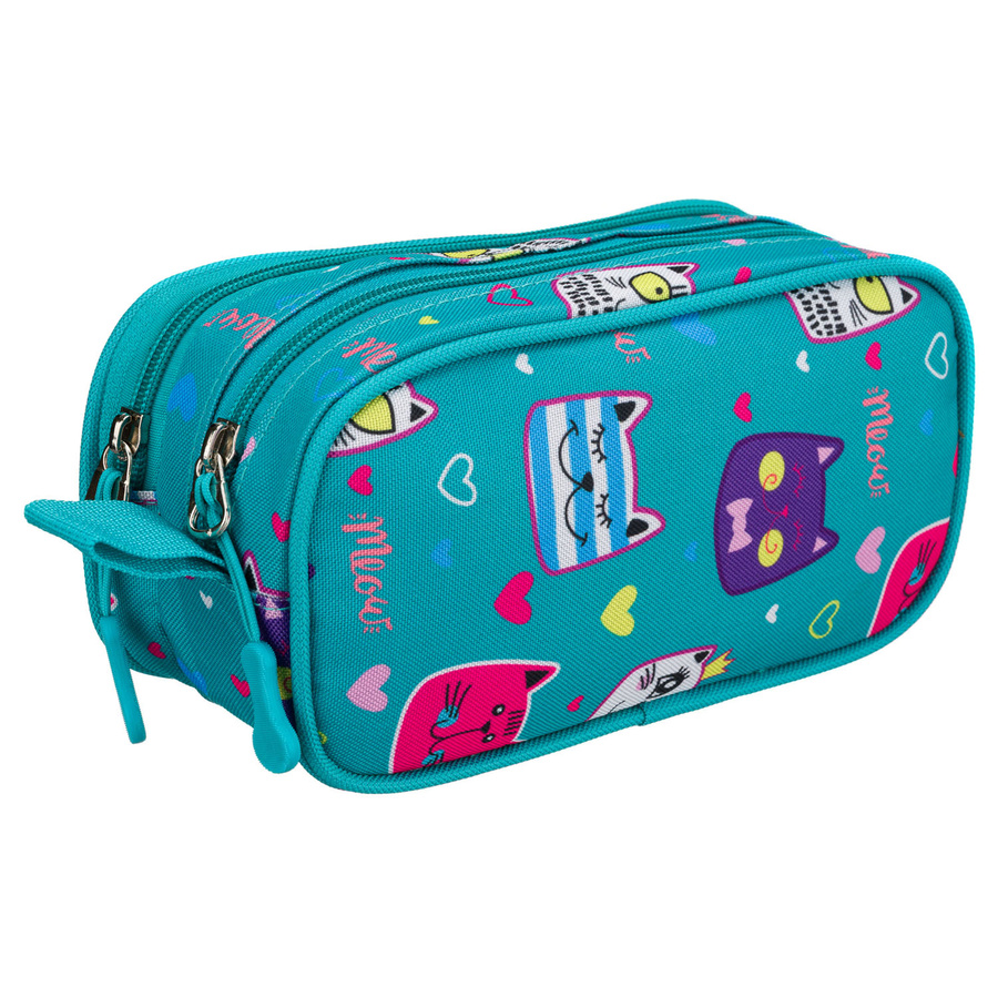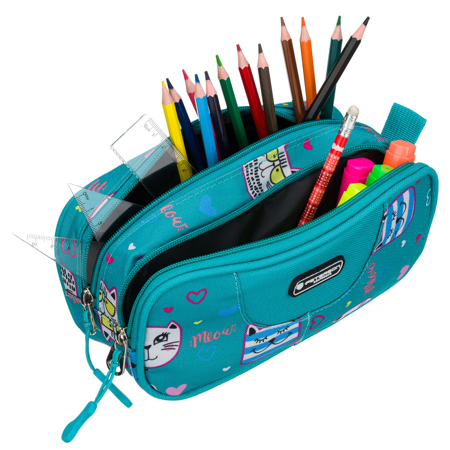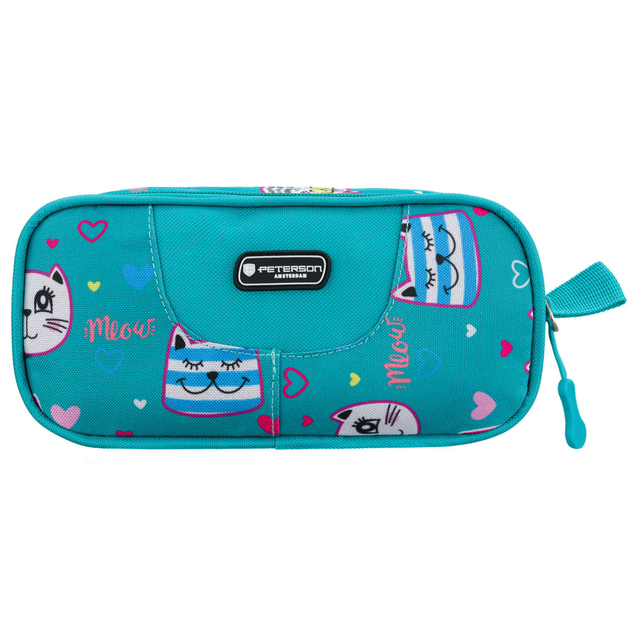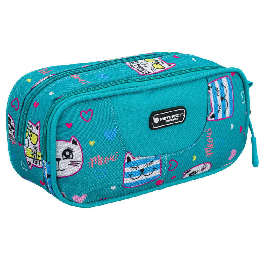 Dwukomorowy piórnik szkolny z poliestru, ozdobiony wzorem w kotki – Peterson