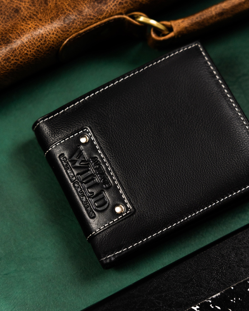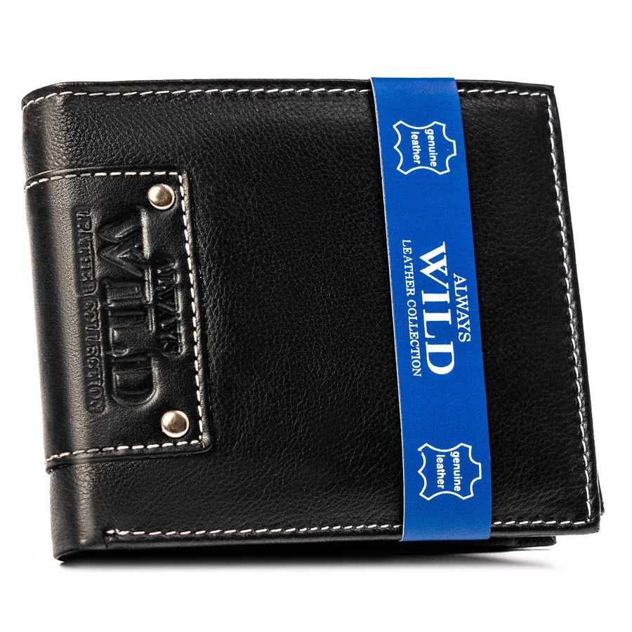 Poziomy portfel męski bez zapięcia. Wykonany z dobrej jakości skóry naturalnej o delikatnym połysku. Na froncie tłoczenie z logo marki Always Wild. Wewnątrz duża sekcja na dokumenty i schowek na suwak. Portfel z systemem RFID Stop.