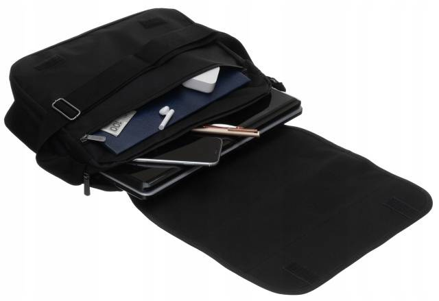 Torba wykonana z trwałego poliestru. Zmieści laptopa z matrycą o wielkości 14″. Komora główna i 3 kieszenie zamykane bezpiecznym suwakiem. Jedna kieszeń mieści się wewnątrz, druga na froncie, trzecia zaś na klapce. W wyposażeniu długi, regulowany pasek.