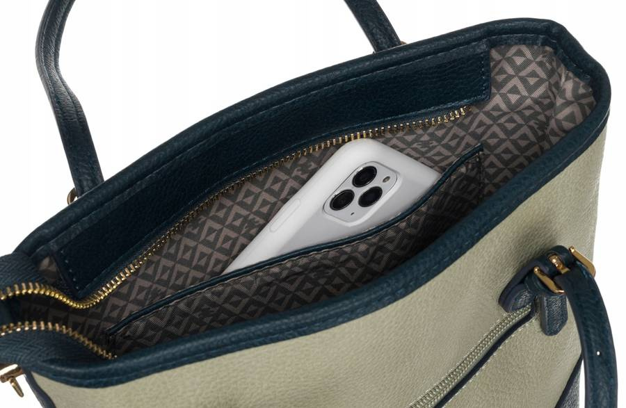 Dzięki pojemnej komorze zapakujesz do niej wszystkie niezbędne drobiazgi, jak portfel, telefon czy klucze do auta. Wnętrze wyposażono w jeszcze 2 kieszonki – jedną otwartą i jedną na suwak. Shopperka ma także kieszeń zewnętrzną, która znajduje się na rewersie i zapina jest zamkiem błyskawicznym.