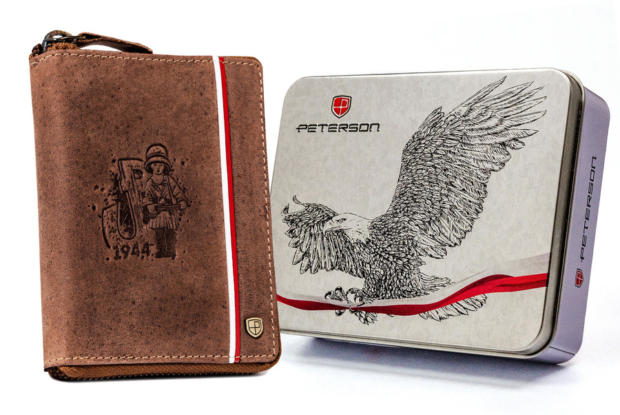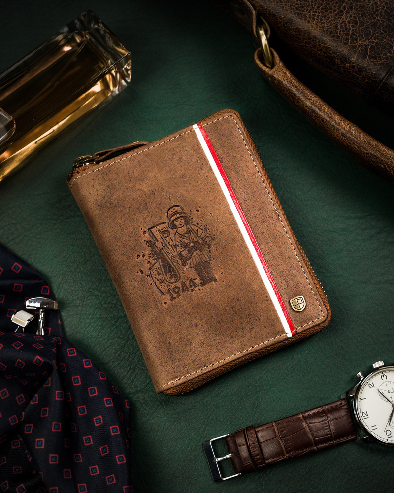 - Patriotyczny design | Portfel o klasycznej stylistyce. Model w orientacji pionowej zapinany w całości na zamek. Na froncie mieści się piękny, tłoczony wzór upamiętniający Powstanie Warszawskie;
