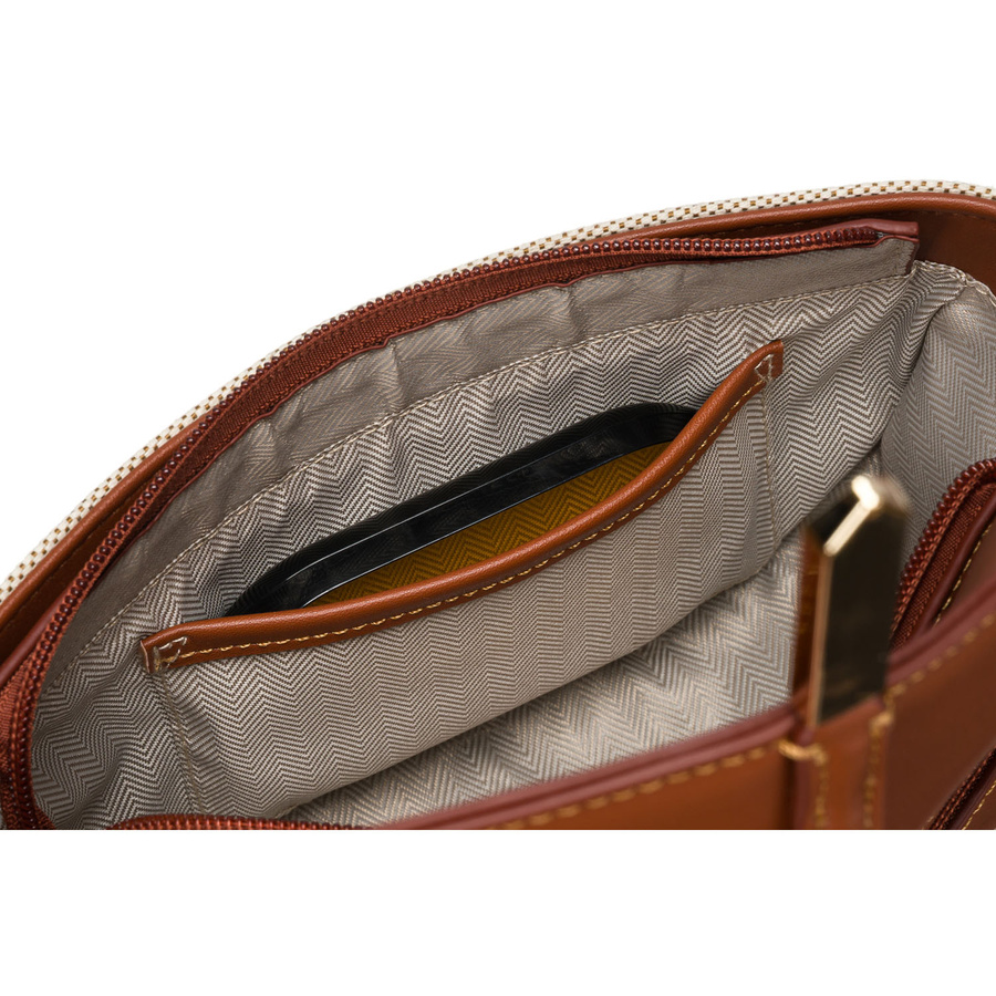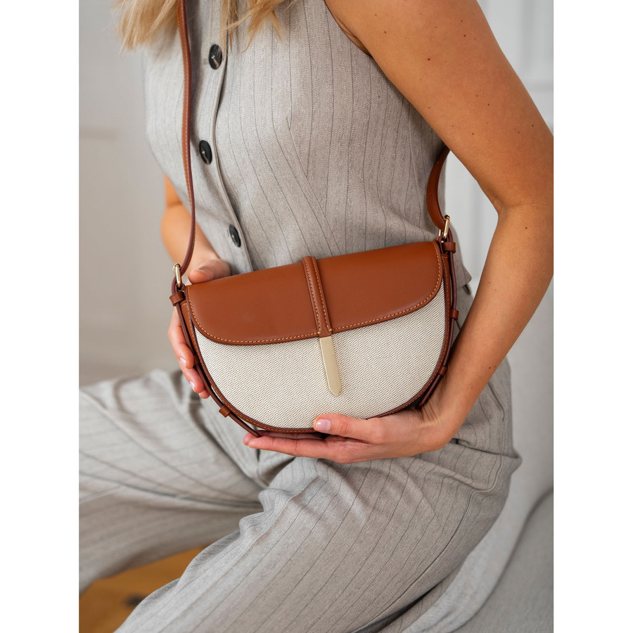 Półokrągła beżowo – brązowa listonoszka damska ze skóry naturalnej i płótna canvas Peterson