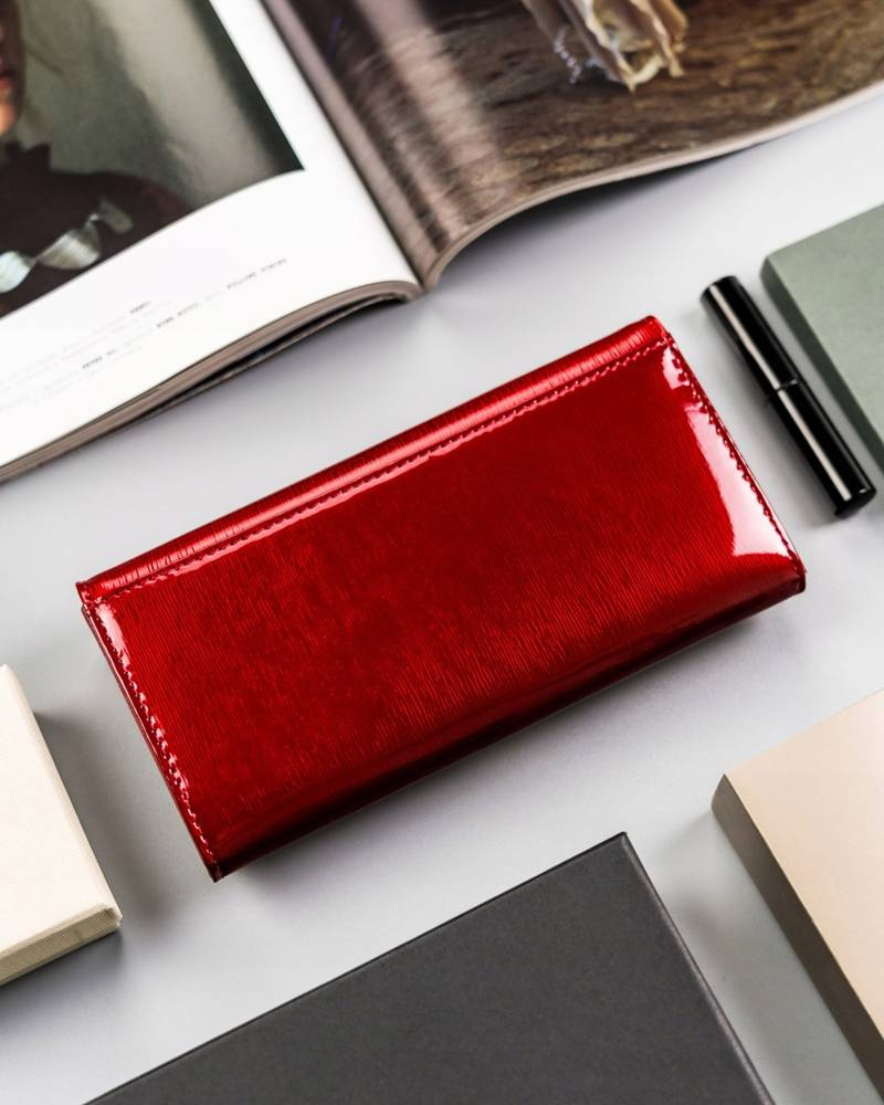 • Zawsze modny design | Portfel w ponadczasowym stylu. Model w całości lakierowany. Pod warstwą lakieru, klapkę zdobi prążkowana faktura;
