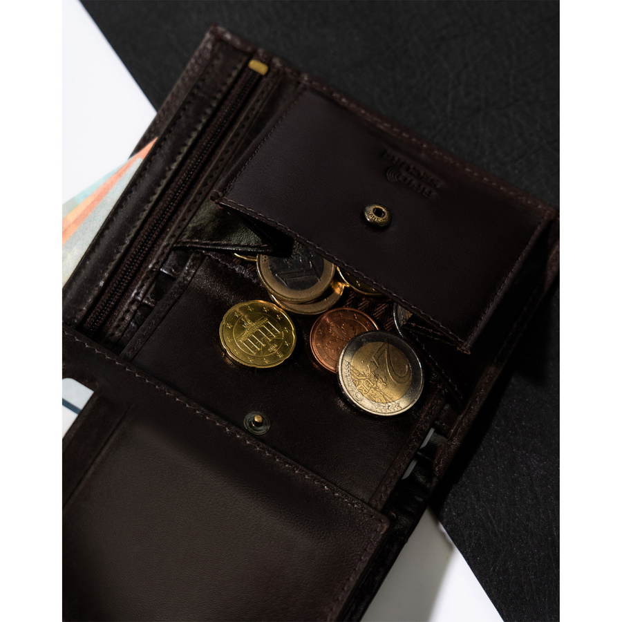 - Sporą kieszeń na bilon zamykaną na nap, w której pomieścisz znaczną ilość monet.