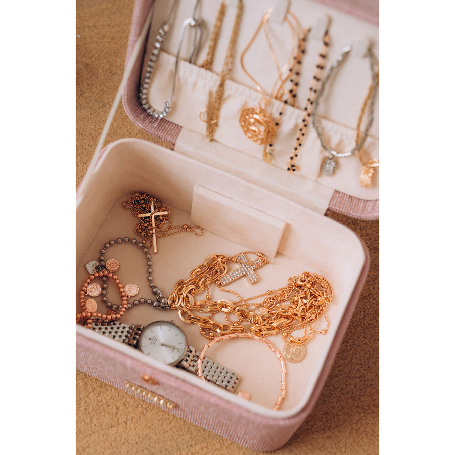 - Pod nimi znajduje się elastyczna kieszonka, która chroni biżuterię przed przesuwaniem się podczas transportu.