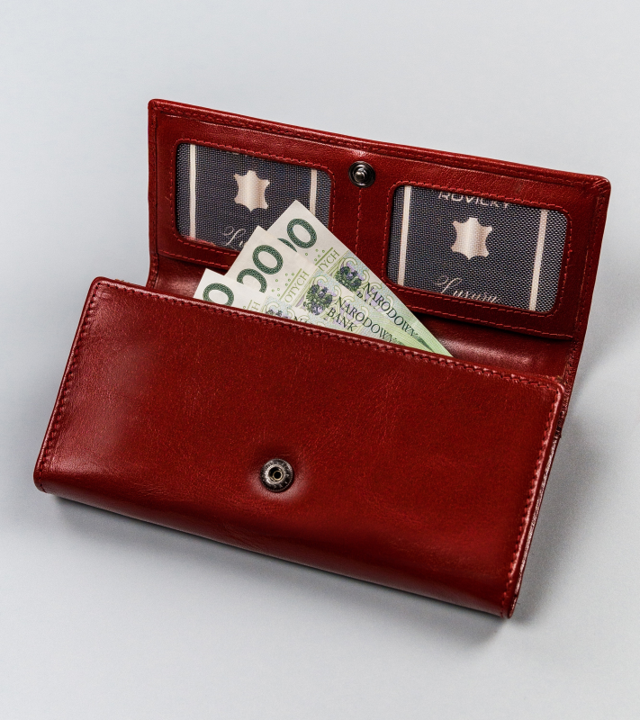 • na banknoty wydzielone są 2 szerokie, otwarte przegródki wyszyte po całej szerokości portfela;