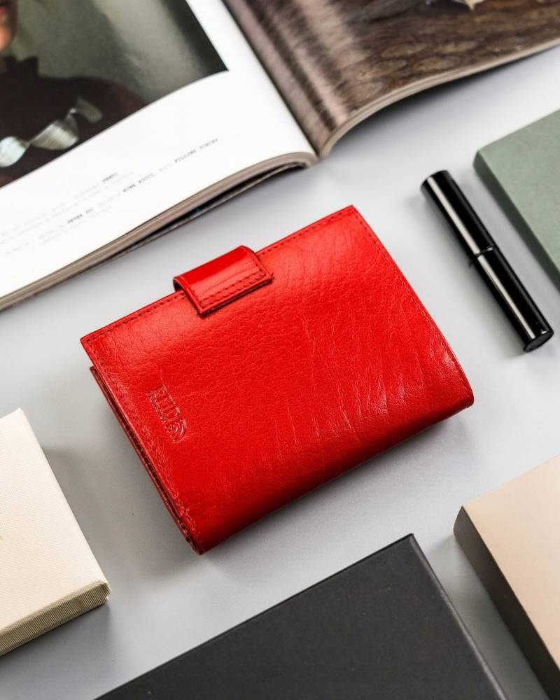 - Klasyczny fason | Portfel o ponadczasowej stylistyce. Model w orientacji poziomej zapinany na trwałe i solidne zatrzaski;