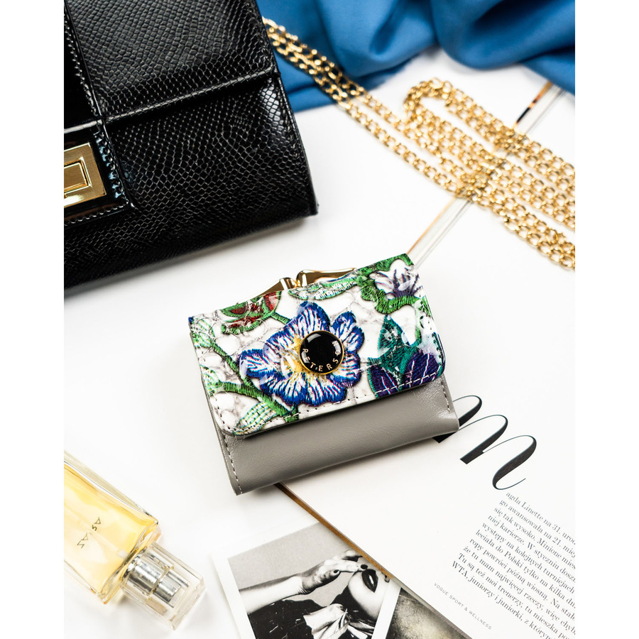 Wielokolorowy portfelik damski ze skóry naturalnej w kwiaty zamykany biglem i zatrzaskiem - Peterson-1