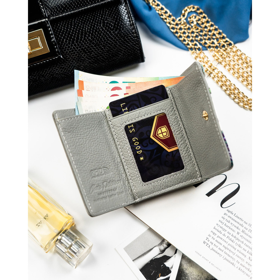 Wykonany z wysokiej jakości naturalnej skóry. Portfel wielokolorowy. Wyposażony w system RFID. Portfel zamykany biglem i zatrzaskiem. Zapakowany w firmowe pudełko prezentowe. Ozdobiony kwiatowym printem.