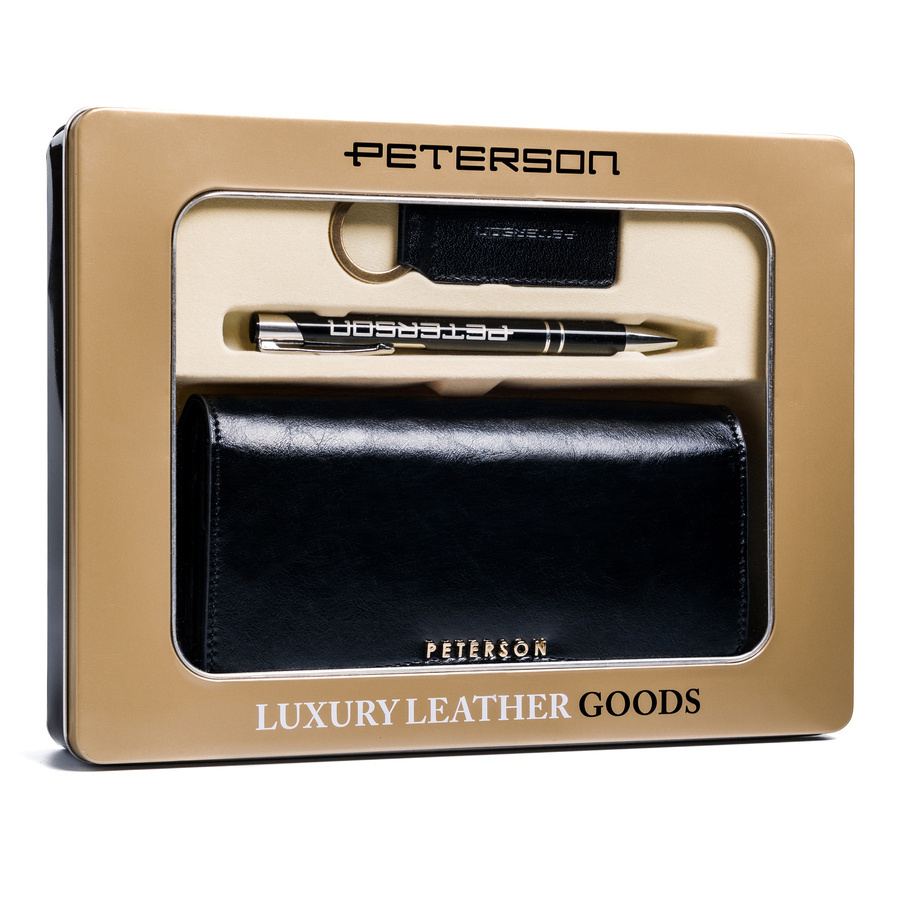Zestaw prezentowy: duży, skórzany portfel damski, brelok i długopis — Peterson