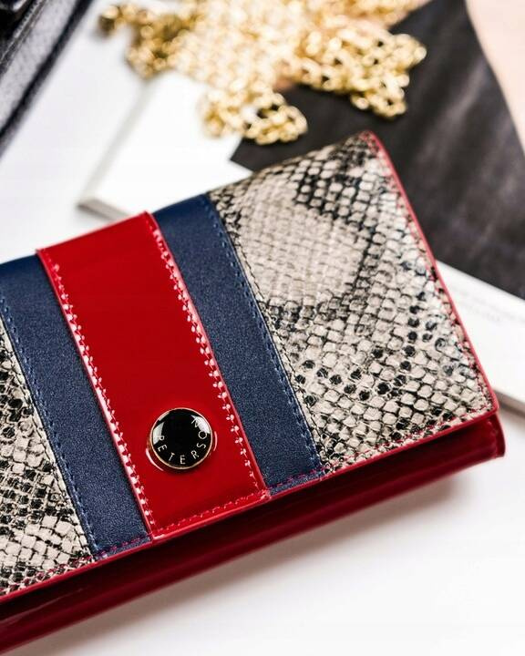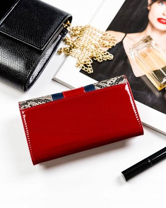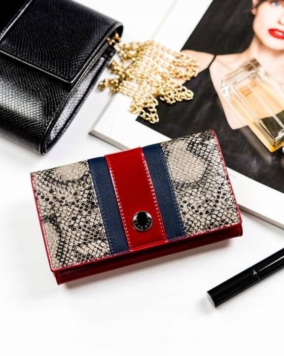 - Modny wzór | Wstawki skóry ze wzorem imitującym skórę węża. Idealnie wkomponuje się w każdą stylizacje. Model w orientacji poziomej zapinany na zatrzask;